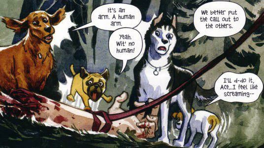Мрачная серия Dark Horse про собакос (sic!) и танатос, несмотря на внушительные девять премий Айснера за четырнадцать лет, разгоняется очень неспешно и поначалу сильно разочаровывает. Незамысловатые приключенческие рассказы в духе подзаборного фэнтэзи оживают, скорее, благодаря акварельной красоте рисунка Томпсон, чем фантазии Доркина. Собаки говорят на странной смеси уличного жаргона и тяжеловесной готической литературы, а их схематические характеры заставляют больше думать о человеческом эго, чем складываются в шерстяные комки индивидуальности. В конце концов, часть обаяния от содержания домашнего питомца — это аттракцион по поиску собственного отражения.