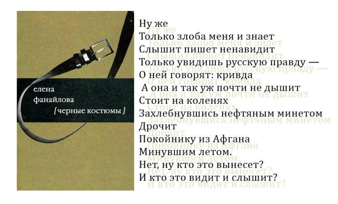 Елена Фанайлова — журналистка радио «Свобода», переводчица, лауреат разнообразных литературных премий, одна из лучших современных гражданских поэтов. Стихи «Черных костюмов» — таинственный лес с Хрюшами и Степашами, умирающими близкими, Ксенией Собчак и хитрым Кадыровым, где «усирается от ужаса» римский поэт Катулл. Почти все тексты начинаются анекдотическими сюжетами вроде «Данила приходит с похорон Ельцина» или «Ларс … Продолжить чтение Ларс фон Триер превращается в женщину: Елена Фанайлова — «Черные костюмы» (2008)